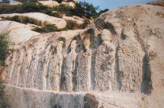 北石北壁上端刻供养人像10身(图八、佛沟摩崖北石北壁),其中男性三身,女性7身,多剥泐不清。