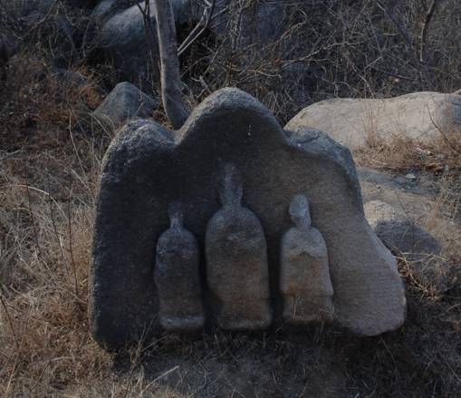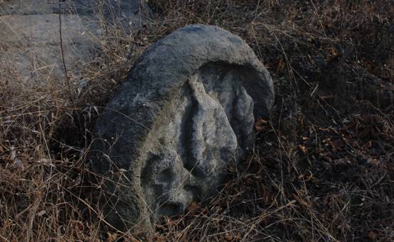 另在摩崖造像的东南角10米左右,还有三处利用自然石块雕造的龛像,每石上雕一浅龛,内雕造像不同。其中一“山”形石上雕一佛二弟子,(图九、一佛二弟子造像)高100厘米,宽108厘米。头部均残,衣纹剥泐不清,跣足立于莲座上。另一处为道教造像,(图十、道教造像一)在一天然圆石上雕凿圆拱形浅龛,龛高93厘米,宽115厘米。龛内雕像三身,主尊头部残,着交领道衣,双手袖于衣内,两腿下垂作倚坐状。其左一人头部残,着交领长衣而立;其右形象与左侧不同,头部与身躯上部残损不清,从残迹看应为护法神像。还有一处龛像刻于圆拱形石块上,(图十一、道教造像二)圆拱形浅龛高73厘米,宽100厘米,内雕造像三身,头部均残,主尊上身修长,双手袖于胸前,结跏趺坐。左侧一人头部残泐,侧身而立,右侧一人身躯残泐较甚,从残存的身躯看,应为一护法神。由此可见,此两处造像应是道教造像。