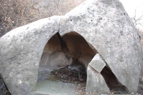 除造像之外,在摩崖造像东南角10余米处还有一处禅窟,(图十二、禅窟)该窟利用一块天然巨石开凿而成,窟高115厘米,宽100厘米,深157厘米。窟口面北,正对着摩崖造像。窟口呈尖拱形,窟口上方有3个圆形孔眼,应为搭建檐棚所凿。窟内平面约呈现方形,在靠近后壁处起一平台,高约20厘米,在靠近左壁处也起一平台,高约30厘米。从窟内面积和形制看,这是供坐禅用的禅窟。