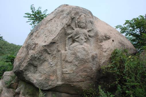 除此处摩崖造像外,最近在距佛沟摩崖造像西南1.5公里处新发现一处十二臂观音造像(图十三、新发现的十二臂观音像),该像雕刻在长8米,高3.4米,厚2.5米的天然巨石上。像高1.15米,宽0.9米,座高0.85米,座宽1.05米。结跏趺于座,造型与前者相同。