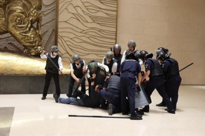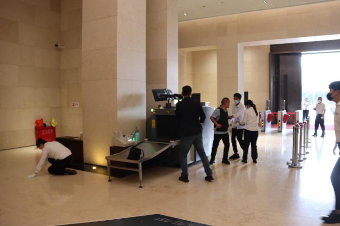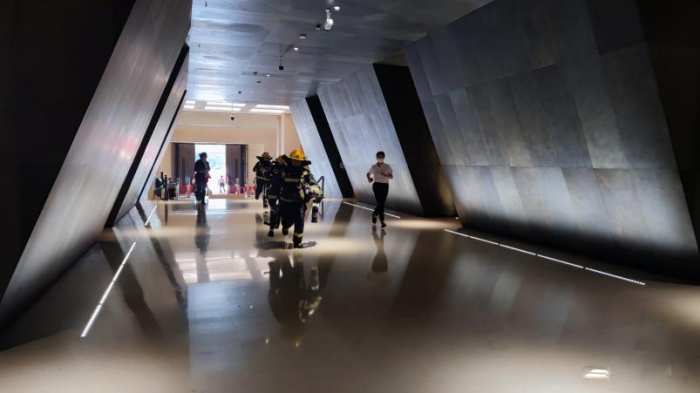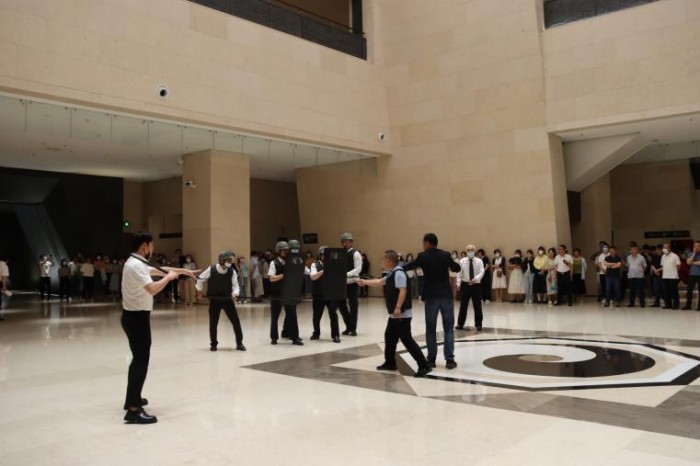 此次演练以博物馆正常开放日,主展馆入口处,由两名职工扮演假想暴力纵火袭击的“犯罪分子”,被安检人员发现后,打伤安保人员,手持凶器强行闯入主展厅,点燃易燃物准备自焚,安保人员临危不惧,按照预案规定的处置程序,一边稳住“歹徒”,与其巧妙周旋,一边传递信息并及时报警,最终制伏“歹徒”。另一方面,微型消防站工作人员按照控制室报警位置,及时赶到并扑灭现场燃烧火源。演练过程中,安保人员分工明确,处置情况沉着冷静,动作操作规范,使犯罪分子的意图无法得逞。