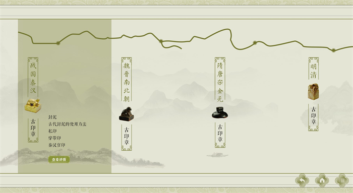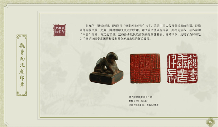 此次展览主要按照时间脉络分为:“战国秦汉古印章”“魏晋南北朝古印章”“隋唐宋金元古印章”和“明清古印章”四个部分。展览中以视频、高清图片和详细的文字介绍,展示出不同时期印章的特点以及印章功能的演化,在展览中,还设计了精彩的互动体验,大家可以制定属于自己的专属印章留作纪念。