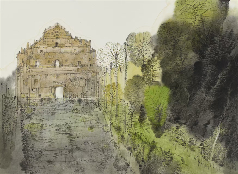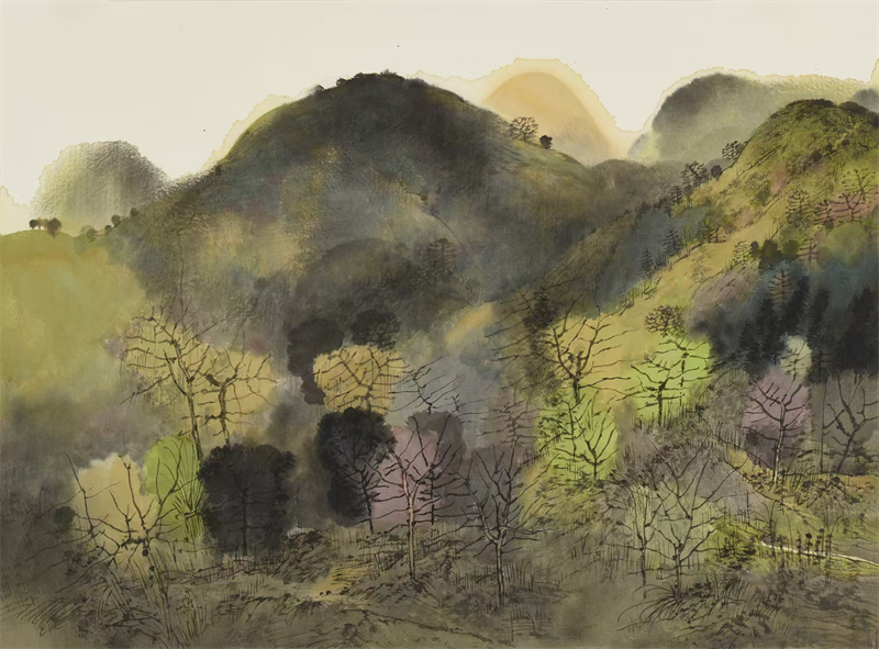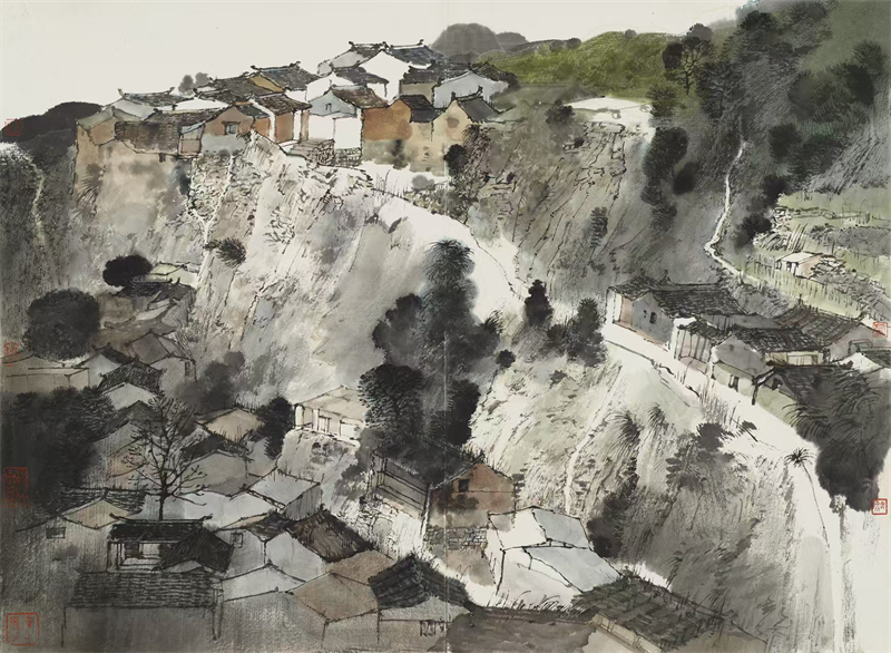 作品中,可以看到画家在艺术创作上的成就与转变。从单纯热爱绘画、实验绘画,到观照内心、亲近自然、用心去感悟自然万象。卢禹舜画笔下的山水中,人与人、人与自然和乐相融。以强烈的个人风格和艺术面貌开创了山水画崭新的艺术形式,极大地丰富了山水画的表现和内容,展示了时代山水的独特艺术魅力。构图上,通过几何结构与符号式表现,打破了传统国画留白的格局,给人耳目一新的视觉效果。在笔墨丹青间,凝聚着他对国画艺术的热爱和追求,更见证了他多年来在艺术创作道路上的坚持和努力。
