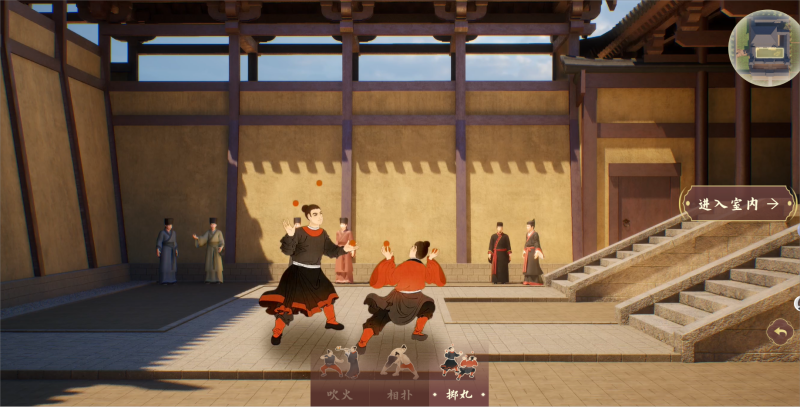 “汉家”云展依托庄园宴饮叙事,构建了“投刺→拜谒→主客宴饮→乐舞百戏→庖厨→田耕全过程线上体验流程,结合空间虚拟漫游的方式,逐层触发,凸显主线叙事逻辑性,确保观众对于汉代庄园宴饮认知体验的完整性,并可实现田耕、仙居场景的跳转。