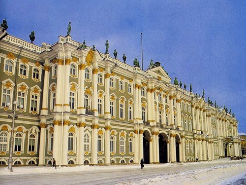 埃米塔什博物馆即冬宫,是世界上最大最古老的博物馆之一。该宫由著名的建筑师拉斯特雷利设计。最早是叶卡特琳娜二世女皇的私人博物馆。1764年,叶卡特琳娜二世从柏林购进伦勃朗、鲁本斯等人的250幅绘画存放在冬宫的埃米塔什(法语,意为“隐宫”),该馆由此而得名。 冬宫初建于1754至1762年间,1837年被大火焚毁,1838至1839年间重建,第二次世界大战期间再次遭到破坏,战后被精心修复。宫殿共有三层,长约230米,宽140米,高22米,成封闭式长方形,占地9万平方米,建筑面积超过4.6万平方米。冬宫的四面各具特色,但内部设计和装饰风格则严格统一。四角形的建筑宫殿里面有内院,三个方向分别朝向皇宫广场、海军指挥部、涅瓦河,第四面连接小埃尔米塔日宫殿。面向冬宫广场的一面,中央稍突出,有三道拱形铁门,入口处有阿特拉斯巨神群像。冬宫四周有两排柱廊,雄伟壮观。宫殿装饰华丽,许多大厅用俄国宝石——孔雀石,碧玉,玛瑙制品装饰,如孔雀大厅就用了2吨孔雀石,拼花地板用了9重贵重木材。埃米塔什是圣彼得堡最大的、最有特色的巴洛克风格建筑物。其完整性与华丽程度都令人印象深刻,装潢丰富,窗上饰框及浮雕装饰给人以力量,圆柱有规律的排列,墙表面由白色、绿色相间配合,使长长的外观形形色色,生动起来。1917年2月前,冬宫一直是沙皇的宫邸,后来被资产阶级临时政府所占据。1917年11月7日(俄历10月25日)起义群众攻下了冬宫。十月革命后,将原来宫廷房舍和整个冬宫拨给艾尔米塔什,1922年正式建立国立艾尔米塔什博物馆,冬宫成为博物馆的一部分。1946年冬宫表面涂成起初的蓝宝石颜色。博物馆现包括五座建筑物:冬宫、埃米塔什、旧埃米塔什、埃米塔什剧院、新埃米塔什。目前,博物馆共分八个部分:原始文化部、古希腊、罗马部、东方民族文化部、俄罗斯文化史部、古钱币部、西欧艺术部、从事导游工作的科学教育部和作品修复部。8个部共有藏品270余万件,包括史前文化和埃及艺术收藏品以及大量意大利、西班牙、德国、英国、俄国、比利时、荷兰和法国的油画及雕刻。其中有1.5万幅绘画,1.2万件雕塑,60万幅线条画作品,100万块硬币和证章,22.4万件古代家具、瓷器、金银制品、宝石与象牙工艺品等。这些工艺品分别陈列在350多个展厅中,如毕加索立体画展厅,意、法画家展厅,俄国历代服装展厅等。所有展厅各具特色,其中最引人注目的是彼得大帝展厅,这里陈列有大量的彼得大帝生前用品,其中许多是他亲手制造的。展厅中的一个玻璃柜中有一尊彼得大帝的腊坐像,头发是彼得大帝本人的真发。肖像旁立有一木杆,木杆上端两米多的地方刻有一道线,以示彼得大帝身高超过两米。同中国故宫一样,该馆藏品异常丰富,因此参观者如果想要走遍所有全部展厅,恐怕花上一个月的时间都不够。