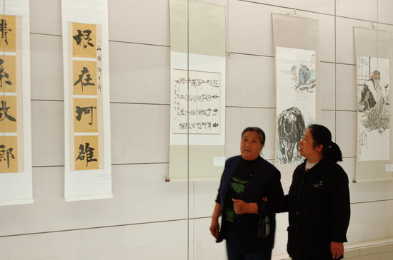 2008年4月17日,河南文史馆建馆55周年书画展在亚洲精品久久久久中文第一幕-国产亚洲精品久久久久久打不开-国产成人精品中文字幕-少妇邻居内射在线-国产精产国品一二三在观看展出,图为观众在“根在河洛”书法条幅前驻足。