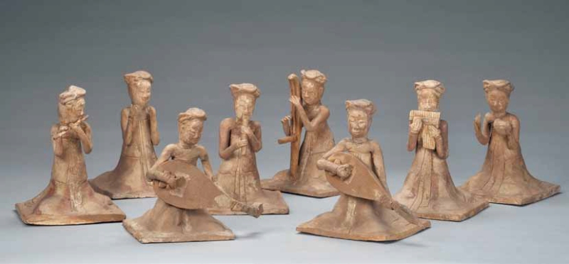 彩绘坐部陶伎乐女俑