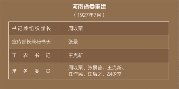 第一次国内革命战争失败后,河南的革命力量遭到了严重摧残,紧急关头,中国共产党毅然担当起领导人民继续革命的重任。1927年7月,周以栗受中央委派重新组建了中共河南省委,周以栗任书记兼组织部长。8月7日,中共中央在汉口召开紧急会议,提出了“枪杆子里面出政权”的思想。中共河南省委在“八七会议”精神的指引下,领导人们多次举行武装暴动和起义,其中确山刘店暴动和信阳四望山农民暴动影响较大。