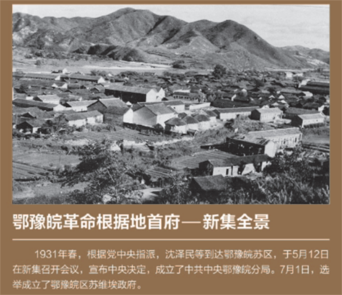 鄂豫皖革命根据地位于湖北、湖南、安徽三省交界的大别山区。是土地革命时期,中国共产党领导创建的仅次于中央苏区的全国第二大革命根据地。鄂豫皖根据地首府新集的全景图和1930年4月至1932年6月根据地的形势图;我军历史上的第一架飞机,也是鄂豫皖军事委员会航空局仅有的一架飞机---“列宁号”等遗迹遗物,是鄂豫皖根据地形成、发展和壮大过程的最好见证。