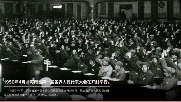 迎着新中国成立的第一缕曙光,河南人民在党和政府领导下迅速医治战争创伤,恢复生产、巩固并加强新生人民政权。1950年4月河南省第一届第一次各界人民代表大会在开封举行。根据郑州所处的地理位置和河南经济发展的需要,1954年底河南省委、省政府、省军区等机关全部迁到郑州。自此郑州成为河南省的政治、经济和文化中心。