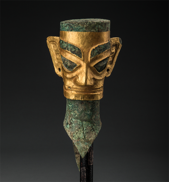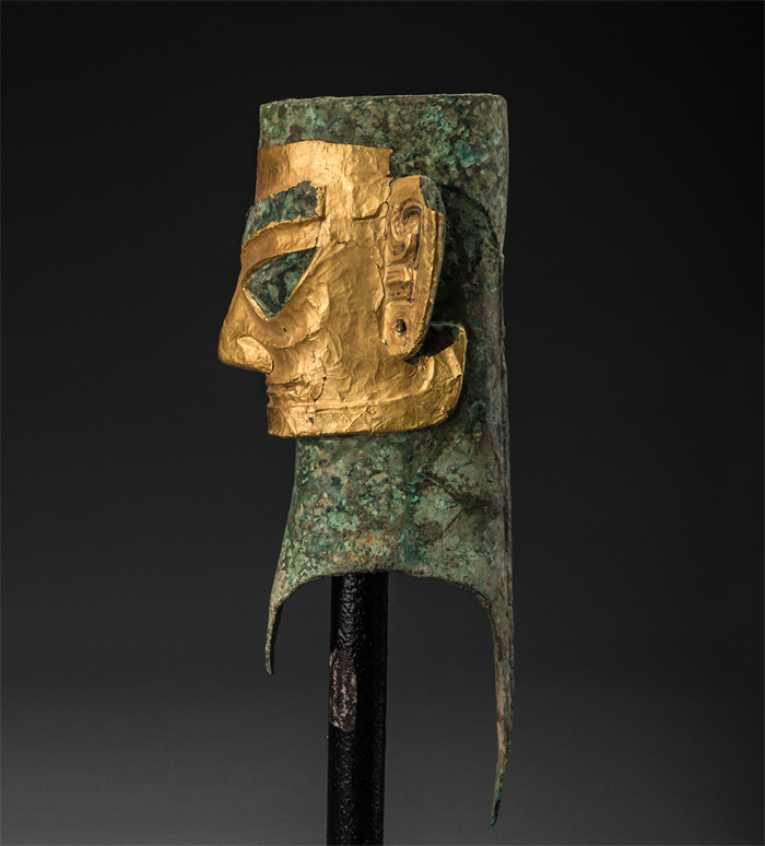 金面罩用金皮捶打而成,大小、造型和铜头像面部特征相同,眼眉部镂空,制作颇为精致,给人以权威与神圣之感。一般认为,这种金面造像代表社会最高层地位的人,他们手握生杀大权,并具有与神交流的特殊技能。