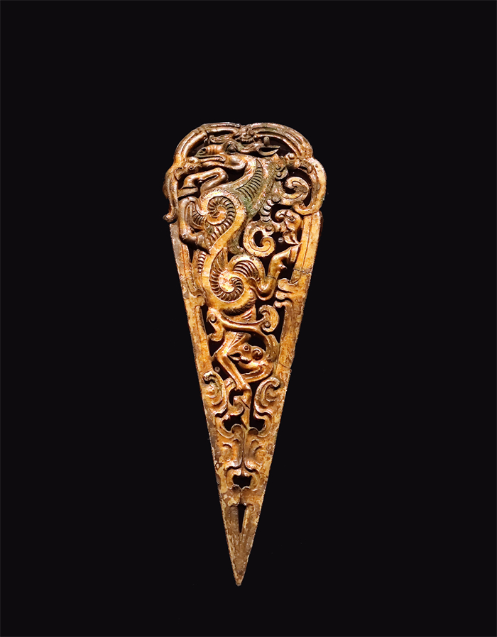 翼马的形象受到外来的影响,尤其是后肢翻转 180°的动物造型,多见于公元前 5 至前 4 世纪的中亚和南西伯利亚草原地区诸部族,而翼马纹周围的云气纹则是中原传统风格。