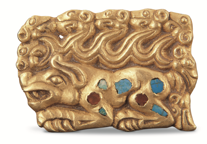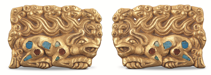 带饰在内蒙古鄂尔多斯杭锦旗阿鲁柴登匈奴墓出土2件, 下部为虎,张嘴露齿,四肢前屈,尾部下垂,身躯部位镶嵌红、绿等宝石,部分脱落。在虎的身上及尾部,有并列的群鸟,鸟身简化为S形。