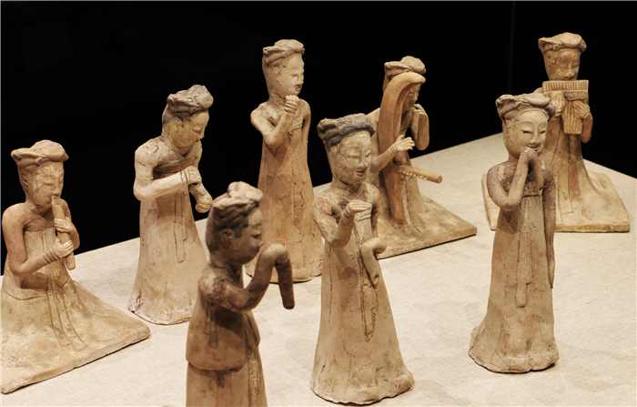 1959年,河南安阳的张盛墓出土了隋代绘彩陶伎乐女舞俑共13件,其中乐俑8件,白陶胎,绘彩,模制。这些乐俑姿态各异,形象生动,踞坐演奏,长裙铺地。除一人外,其余7人分别手持的乐器为琵琶、五弦琵琶、竖箜篌、排箫、横笛、钹、筚篥,演奏造型惟妙惟肖,共同组成一场别开生面的小型宴乐演出场面。