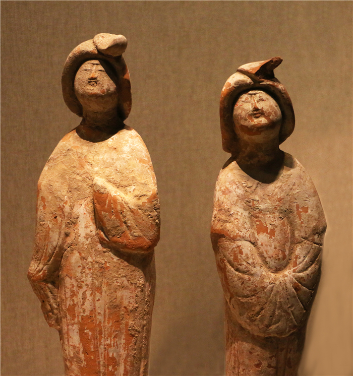 这组红陶女俑均出土于河南洛阳,唐代文物,通高36—40厘米。俑整体丰满肥硕,体现出大唐盛世的繁荣风尚。女俑面部扁平,目、鼻、口紧凑,两颊丰润,嘴缄合。女俑均头梳假髻,身着阔袖曳地长裙,或加襦,或加半臂,足蹬翘首履,昂首站立于委角方板座上。女俑姿态各不相同,有的袖手于腹前,有的双手交握于胸前,有的一手抚胸,一手下垂,仪态端庄,这份丰腴雍容中的雅致,正是诗仙李白在《清平调》中所描绘的“云想衣裳花想容,春风拂槛露华浓”的大唐仕女形象。