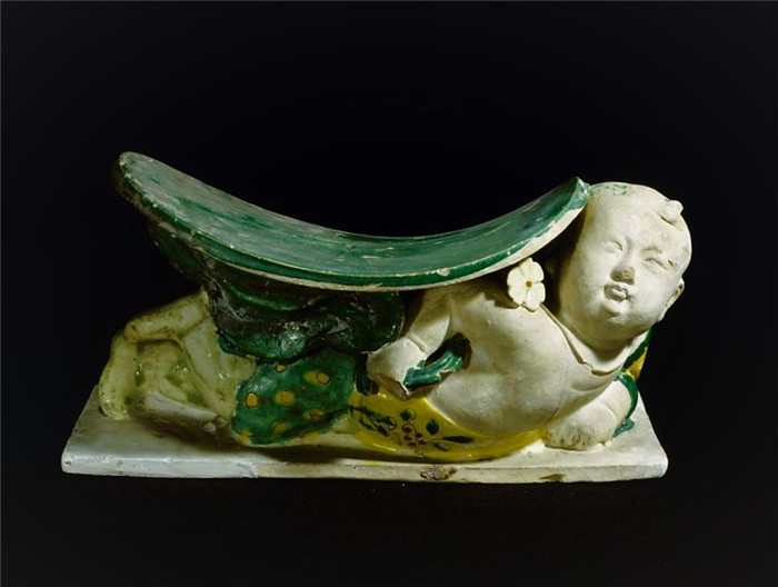 陶瓷枕属于凉枕,具有清凉降温的功效,是古人夏日避暑的用具。河南省上蔡县宋墓中出土的这件三彩童子荷叶枕,通体施黄、绿、白三彩。枕的底部是粉白色的长方形托板,托板上卧着一个童子。童子头顶蓄发,颈戴项圈,手脚饰有钏、镯。右臂袒露,向后微曲,下身穿绿色短裤。面目圆润,目视前方,头微微上仰,左手压于身下,右手执荷叶在身上作为枕面。在荷叶状枕面和童子臂部之间左右各有一个折叠的小荷叶,将枕面与童子巧妙地连接成一体。此枕的造型使人仿佛看到一群眉清目秀,天真可爱的孩童们在晴空丽日下,乘着一叶小舟,手执荷叶在湖面上打闹戏耍。