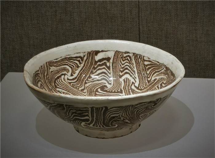绞胎工艺盛行于唐宋时期,以唐代巩县窑和宋代当阳峪窑烧制的绞胎瓷器最为精美。这件当阳峪窑绞釉瓷碗为宋代文物,高4.5厘米,口径11厘米,足径4.9厘米。
