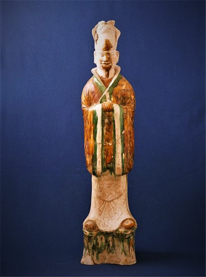 三彩文官俑,唐代文物,高119厘米,头戴高冠,身穿广袖黄袍,袍边及袖口饰翠绿和粉白色釉,内着白裳,长垂至地,腰间束带,足蹬靴,立于椭圆形束腰镂孔座上,身材修长,双手拱于胸前,面部表情严肃。