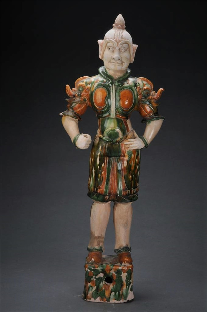 武士俑作为镇墓神物,在唐墓中往往成对出现。这两件三彩铠甲武士俑,身材魁梧、挺立凝神、勇猛刚健、不怒而威,充满了力量,展现出大唐富丽堂皇的气象与神韵。
