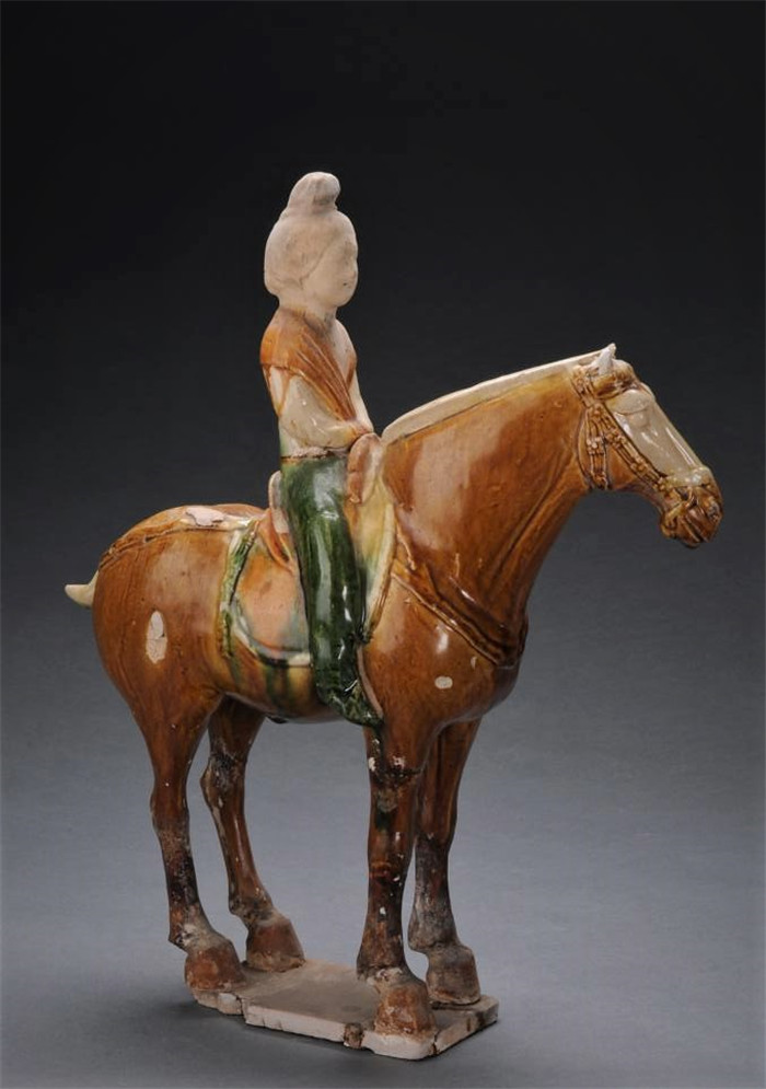 三彩骑马披帛女俑为唐代文物,出土于河南洛阳,施釉光润。通高41.1厘米,马长34.5厘米,白陶胎,模塑。马躯体施褐红釉,膘肥体壮,骨肉停匀,头小颈长,昂首竖耳,腿部强劲有力,站立于长方形托板之上,富有动感,“胡马大宛名,锋棱瘦骨成。竹批双耳峻,风入四蹄轻”的神骏宝马形象跃然眼前。马背上置绿褐色障泥鞍鞯(音同坚),鞍鞯上骑坐一女俑,头梳高髻,着白色窄袖翻领襦衣,足蹬软靴,肩披浅褐色帛,双手勒缰,神态怡然。仕女和马的造型比例适度,形态自然,线条流畅,生动活泼,是一件不可多得的唐代三彩精品。