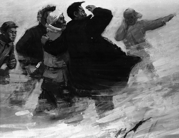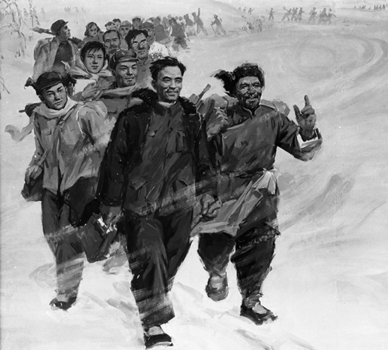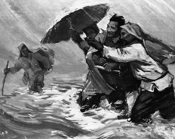 焦裕禄认为,雨越大越是掌握水害规律最有利的时机。他往往冒雨站在激流中,观看水的流势,画出一张张水势流向图。图为焦裕禄冒着七天七夜的大雨,忍着阵阵肝痛,站在洪水激流中,测画水的流向图。