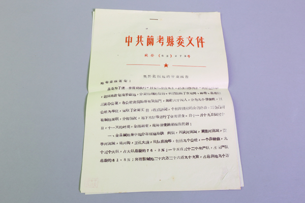 实物:关于一年来除“三害”斗争的报告。 文物号105 27x19