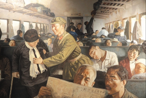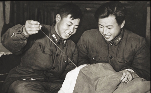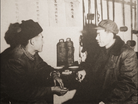 1960年11月11日,抚顺市望花区和平人民公社副书记张荣祥(右)来雷锋所在连队表示感谢。