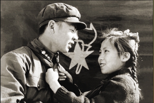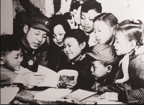 从1960年10月起,雷锋先后担任建设街小学和本溪路小学的校外辅导员,图为少先队员给雷锋戴红领巾。