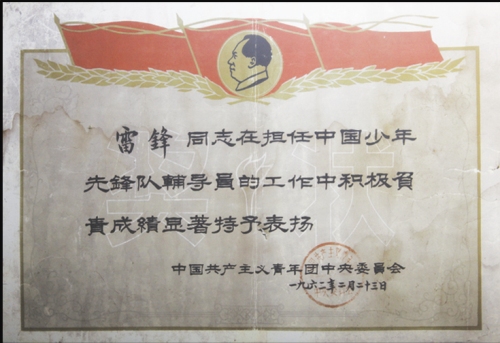 1963年2月,共青团中央颁发给雷锋的少先队辅导员奖状。