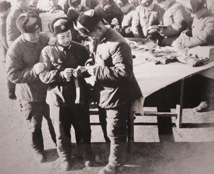雷锋所在连举办“雷锋艰苦朴素事迹展览”。图为雷锋在展会上向战友介绍缝补经验。